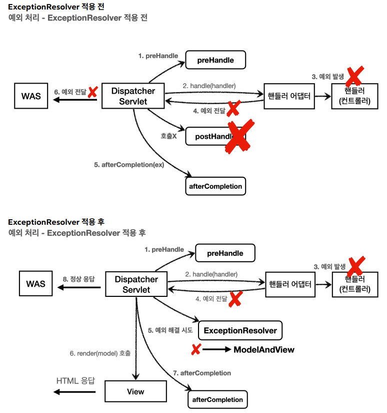 ExceptionResolver 로 예외를 해결해도 postHandle() 은 호출되지 않는다.