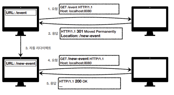 자동 리다이렉션을 통해 웹 브라우저는 event로 요청을 보냈지만, 301 상태 코드와 함께 Location 정보가 왔기 때문에 Location 필드에 있는 URL로 자동으로 옮겨가게 됨. ( 사용자는 모른다. )