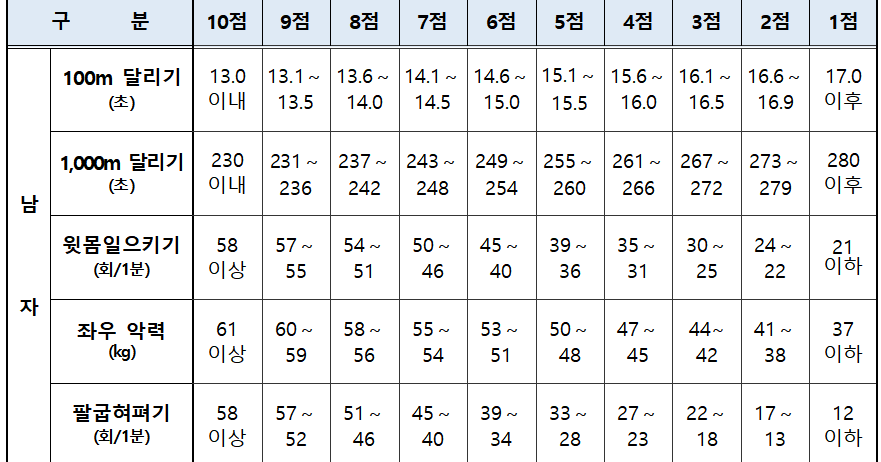 현재 체력 시험은 100미터 달리기, 1000미터 달리기, 윗몸일으키기, 악력, 팔굽혀펴기 로 구성되어 있다.