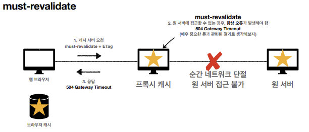 → 캐시 만료 후 최초 조회시 원 서버에 검증해야 함, 원 서버 접근 실패시 반드시 오류가 발생 ( 504 Gateway Timeout )