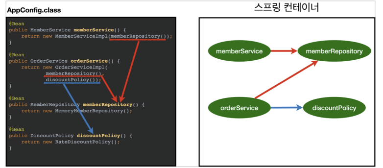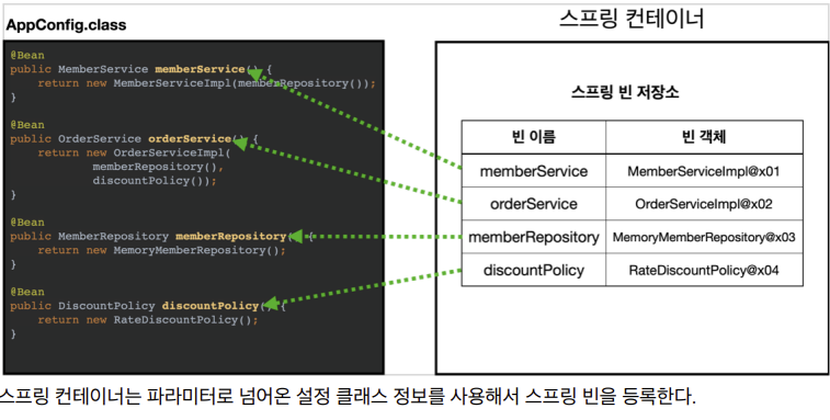 내가 만든 인터페이스, 구현체들을 AppConfig를 통해서 스프링 빈으로 등록하고 파라미터 및 DI를 설정해준다.