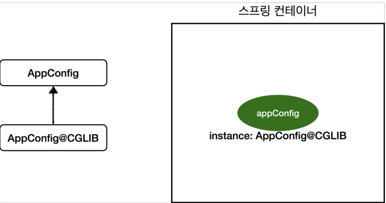 → 이것은 내가 만든 클래스가 아니라 스프링이 CGLIB라는 바이트코드 조작 라이브러리를 사용해서 AppConfig 클래스를 상속받은 임의의 다른 클래스를 만들고, 그 다른 클래스를 스프링 빈으로 등록한 것이다!
