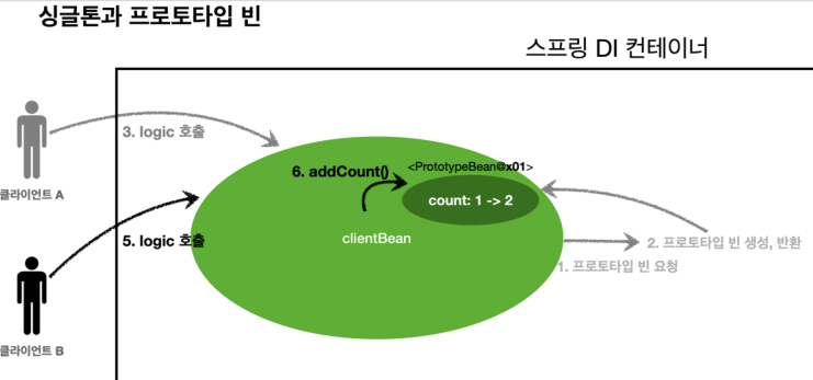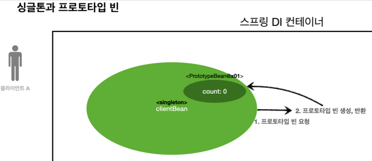 [ clientBean은 의존관계 자동 주입을 사용, 주입 시에 스프링 컨테이너에 프로토타입 빈을 요청 ]